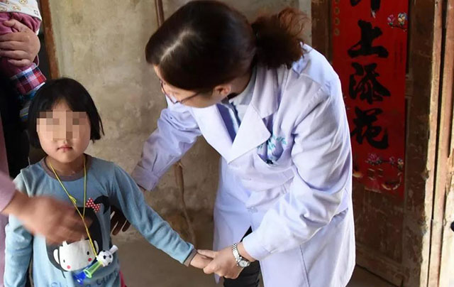 彩云行动爱心医师组成员朱玉菊为小涵详细检查患病部位