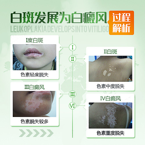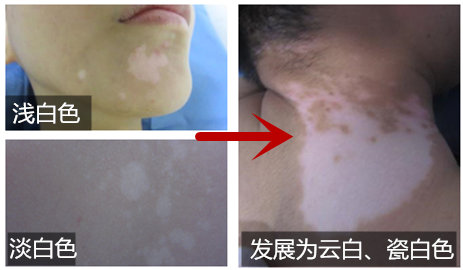 白斑发展为白癜风后,随着病情的发展,白斑会增多,面积增大,逐渐连成一片一片的,相邻的白斑融合在一起,形成大面积的白斑。白斑颜色也会加深,因为黑色素脱失严重,黑色素细胞功能已接近完全脱失,治疗难度较大。