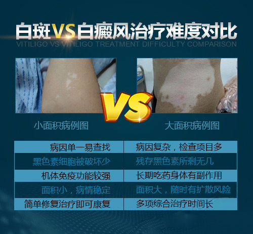 白斑和白癜风的区别,在于黑色素脱失程度的不同,早期白斑皮损部位还有残余大量色素,皮肤白斑的黑色素细胞功能仅损伤一至二成左右,病情较轻,抓住早期治疗,进行简单的修复治疗,即可康复。