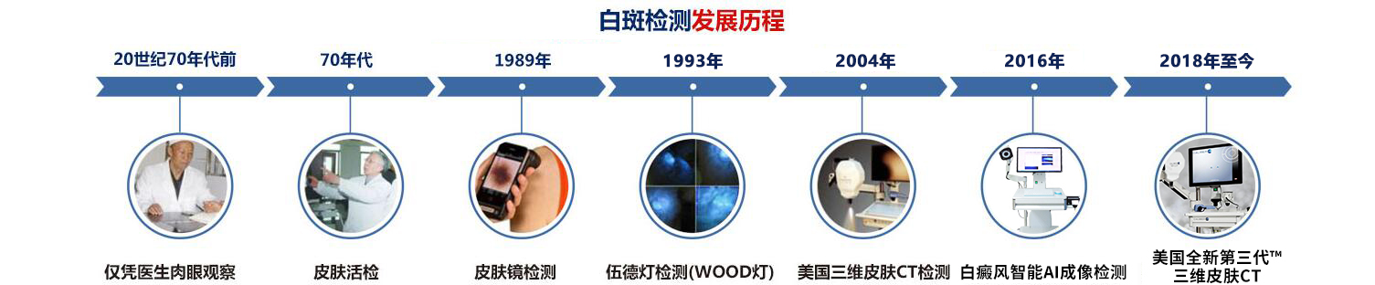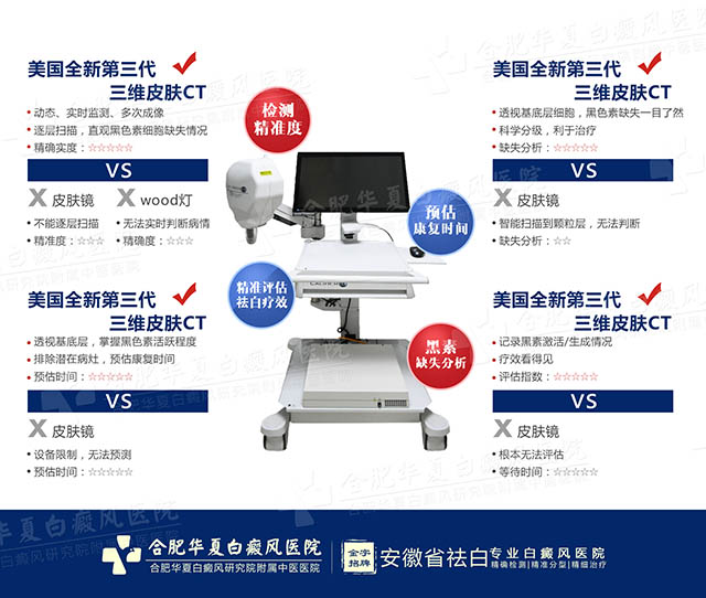4、光学立体检测,更快捷:“美国三维皮肤CT”采用光学聚焦原理,图像敏感性和分辨率高,只需十几分钟,可以在细胞层面成像,不但可以定量比较病损和正常皮肤色素之间的区别,还可以直接扫描出白癜风患者病变情况,对治疗过程进行监测、记录,以便更科学的评价治疗效果,为科学诊断、治疗提供了可靠的依据。
