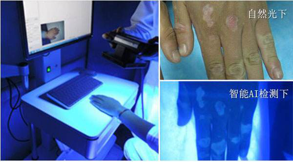 利用皮肤黑色素对UVA光的吸收作用,而失去黑色素的皮肤则产生折光的原理,白癜风智能(AI)成像检测系统,通过采用的LED技术,将获得的波长为365±2nm的长波UVA光源照射病变部位,病变部位产生强弱不一的折光,经高清高分辨率的彩色传感器,获得病变部位的图像;并通过皮肤影像分析功能,自动对焦和抖动识别,实现皮损部位与正常皮肤的对比,分析色素缺失程度,精准辨识病症是否白癜风;同时根据皮损状态下的黑色素细胞形态、数量,自动查找病因,出具诊断结果,并对白癜风实行针对性的有效治疗。