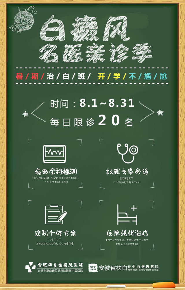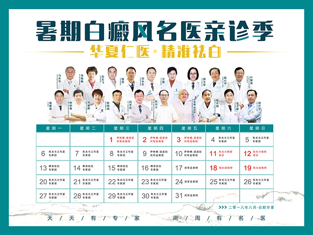 基于此,合肥华夏白癜风医院积极响应国家医改政策,充分考虑白癜风疾病治疗周期,不断筑巢引凤、吸纳优秀医学人才,汇聚一批国内外优质的白癜风名医名家,于2018年8月1日—8月31日开展“暑期白癜风名医亲诊季”活动。旨在帮助白癜风患者,利用夏季最佳的祛白时节,接受全面、科学、有效的治疗,确保广大白癜风患者天天看专家,周周见名医,以得到最规范、最精准安全的诊疗,享受到“专家特定性、方案个体化、疗法针对性、就诊优先性、康复便捷性、健康动态化、长期监控性、有效防复发”等特殊化诊疗服务,助力患者早日重拾健康肤色,拥有多彩人生。