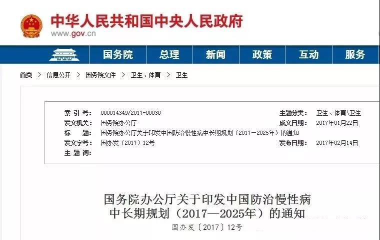 为加强慢性病防治工作,降低疾病负担,提高居民健康期望寿命,努力全方位、全周期保障人民健康,依据《“健康中国2030”规划纲要》,国务院制定《中国防治慢性病中长期规划(2017—2025年)》 国办发 {2017} 12号