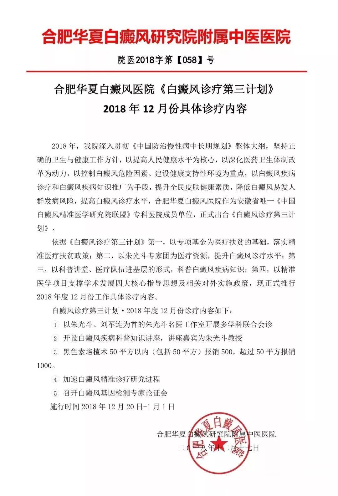 依据《白癜风诊疗第三计划》相关计划内容,现正式推行《白癜风诊疗第三计划》。2018年12月具体诊疗安排如下:
