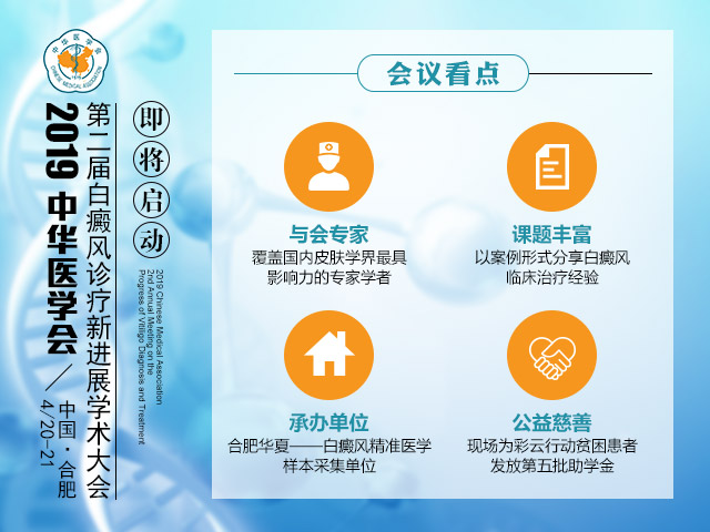 2019,随着精准医学全面应用白癜风临床诊疗,白癜风基因检测通过专家论证已进入辅助白癜风疾病诊疗应用阶段,基于此,由中华医学会主办,合肥华夏白癜风医院承办的“中华医学会安徽省第二届白癜风诊疗新进展学术大会”,将于4月20-21日在合肥举行。