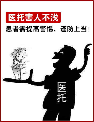 “医托”(又称“医媒子”),专骗那些分辨能力不强,防范意识较弱,求医心切的老人、农民和外地人。此类案件占近几年来诈骗案件总数的30%。选择到医院就医时,遇到陌生人主动搭讪要小心,不要轻信凭空冒出来的老乡、亲戚或朋友。不要相信其口中夸张的疗效,所谓的“神医”,选择正规的医疗机构就诊才是明智的选择。如遇到以“检查半价”“免费体验”“治疗援助”等名义说服你到指定医院就诊的情况,一定要小心谨慎,切莫贪图便宜,谨防上当受骗。